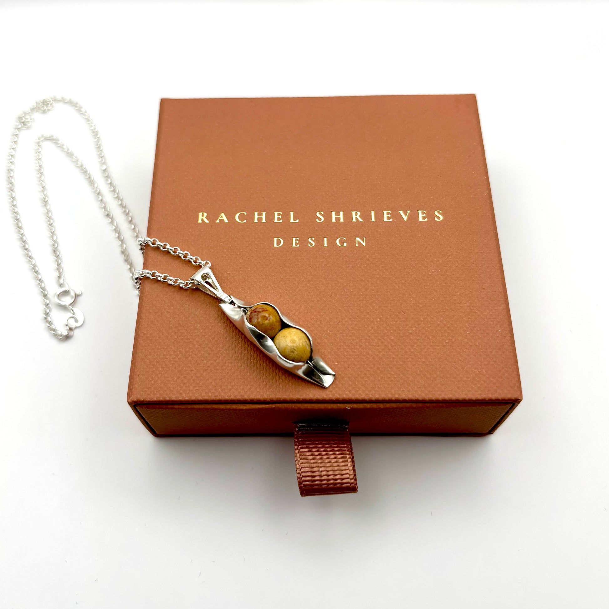 The Two Peas In A Pod Necklace is a unique and meaningful 35th anniversary gift for your wife, lovingly handcrafted in the UK using genuine fossilised coral gemstones in 925 Sterling silver or luxurious 18ct gold filled metal.